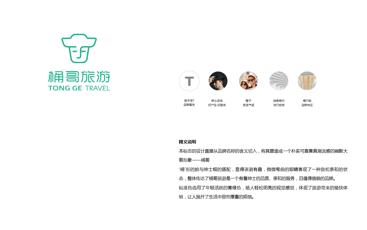 標(biāo)志以字母T為外形,‘桶’形的臉與紳士帽的搭配,顯得詼諧有趣,微微彎曲的眼睛表現(xiàn)了一種放松親和的狀態(tài),整體傳達(dá)了桶哥旅游是一個(gè)有著紳士的品質(zhì)、親和的服務(wù),且值得信賴的品牌。