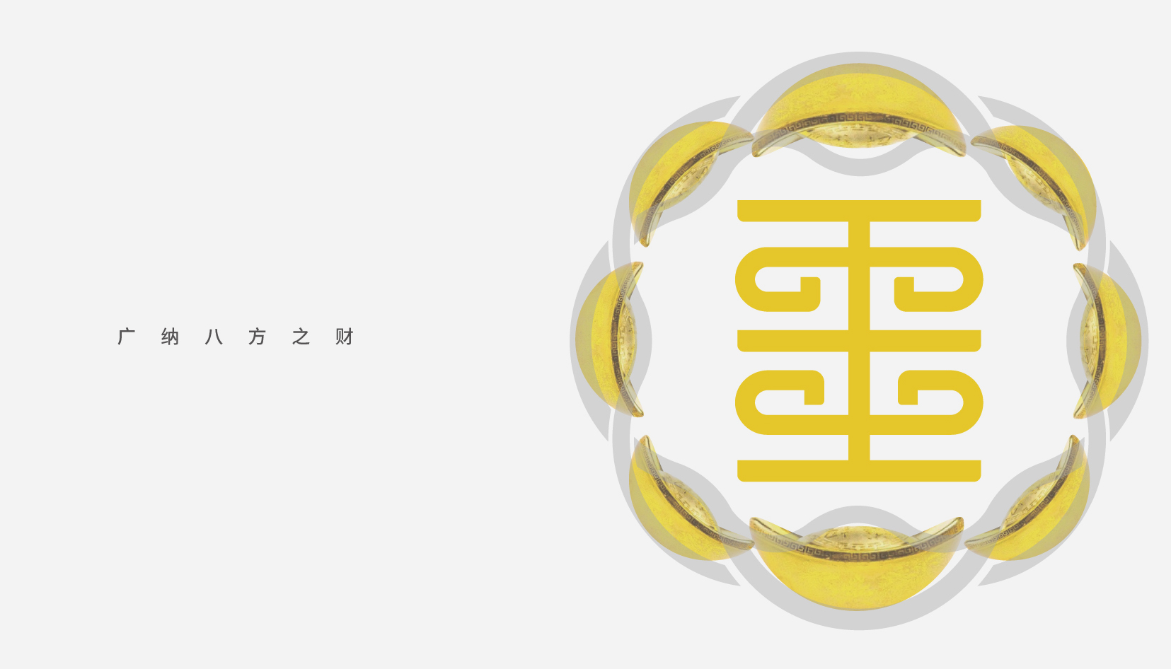 ‘金’字的寶蓋頭巧妙的設計成金元寶的造型,并相互環(huán)繞穿插,形成八個金元寶,寓意廣納八方之財;‘金’字中間的筆畫融入回紋元素,傳達出古典中國美和企業(yè)的文化底蘊