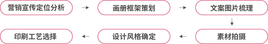 營銷宣傳定位分析->畫冊(cè)框架策劃->文案圖片梳理->素材拍攝->設(shè)計(jì)風(fēng)格確定->印刷工藝選擇