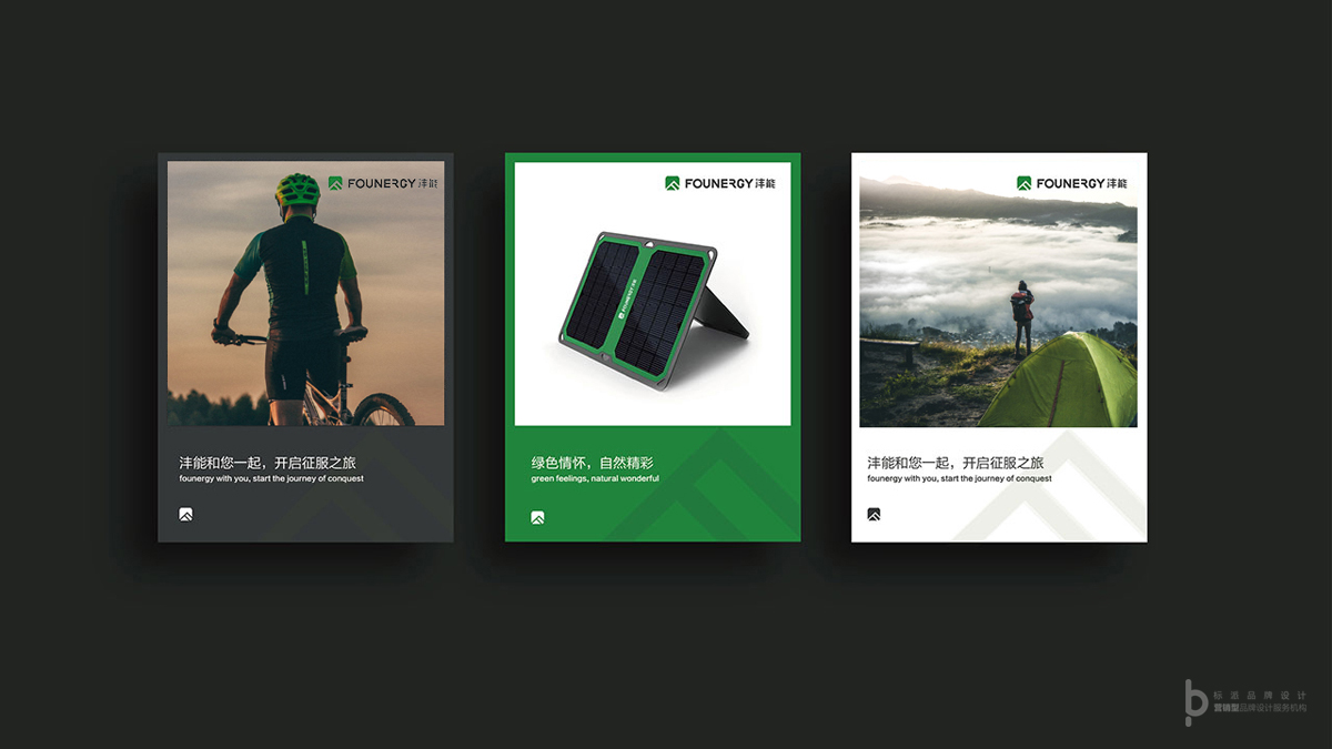 元素會(huì)以太陽(yáng)(能源),綠葉(環(huán)保),山峰(戶外,前進(jìn),冒險(xiǎn)).和品牌名稱首字枰'F''N'進(jìn)行融合設(shè)計(jì),得到屬于灃能品牌特有的圖形元素。
