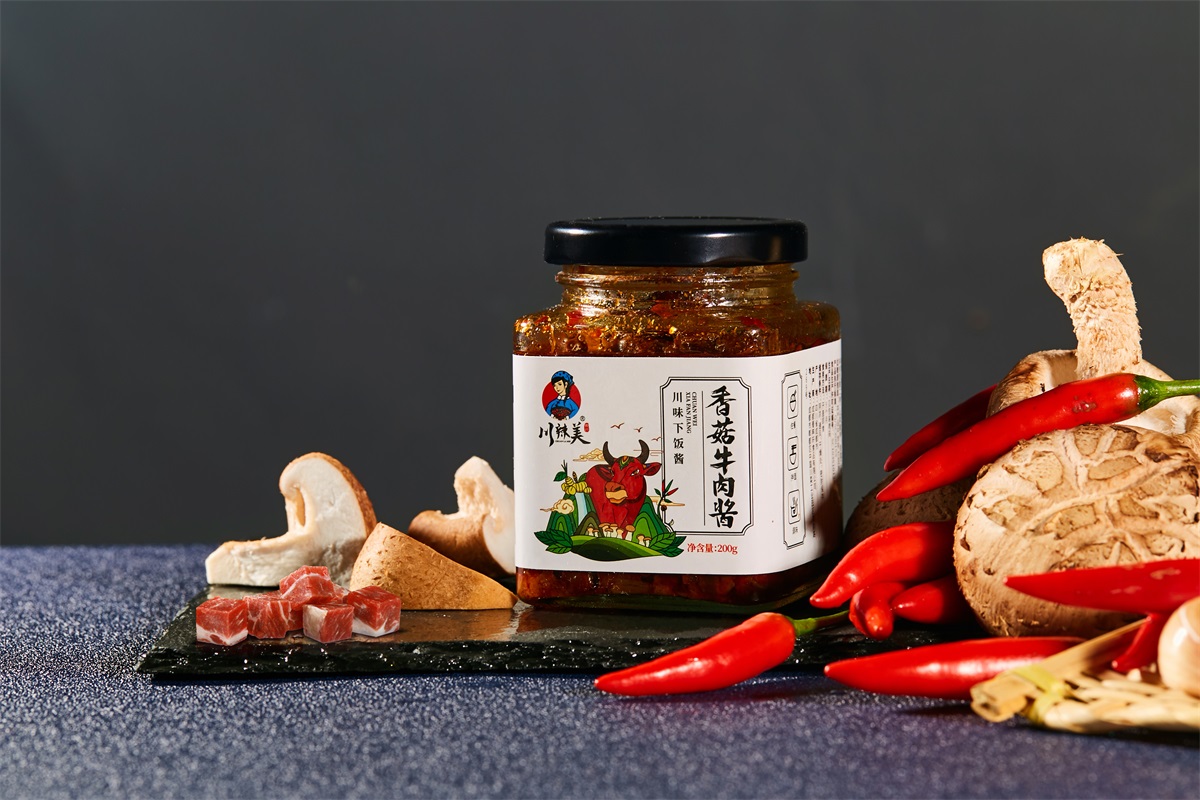 川辣美辣椒醬屬于地方特產類,本方案選用了方形的玻璃瓶+瓶身標簽設計的形式。 來自四川的美味辣椒醬品牌,古風、韻味、親和,從品牌logo設計,包裝瓶的選擇,到系列包裝形象設計,方案將雙椒醬、燒椒醬、香菇醬、香菇牛肉醬四個品類以插畫風格進行創作,以系列感來呈現,品牌感強,接地氣
