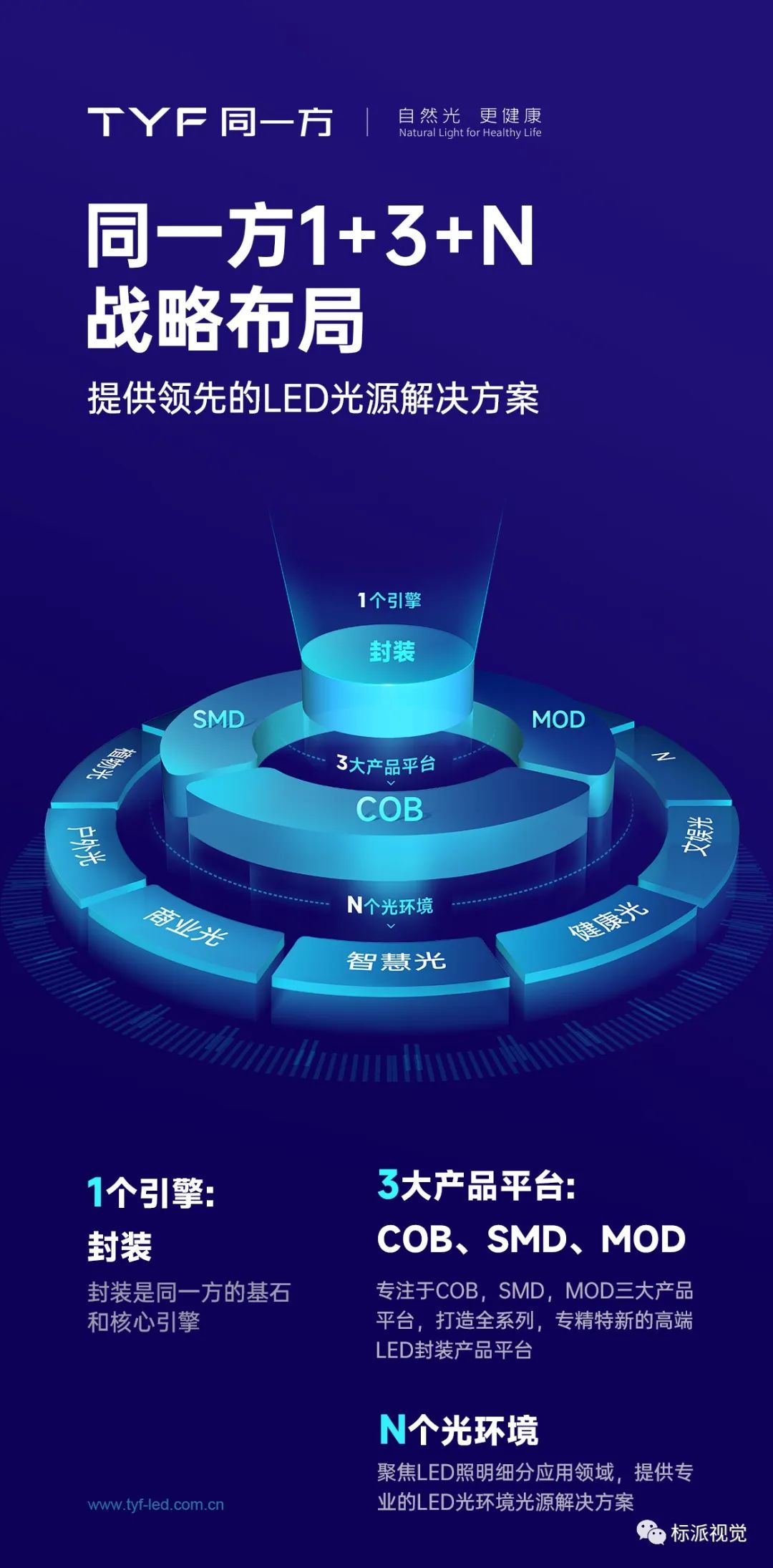 同一方始終堅持“1+3+N”戰略布局。1個核心:以封裝為基石和核心引擎;3大產品平臺:COB 、 SMD 、 MOD 全系列專精特新LED 封裝平臺;N個應用場景:智能照明、健康照明、植物照明、商業照明、戶外照明、文娛照明等。堅守LED通用照明市場的深耕與發展,探索LED 照明細分應用領域的創新,為行業提供更專業的 LED光源光環境解決方案。